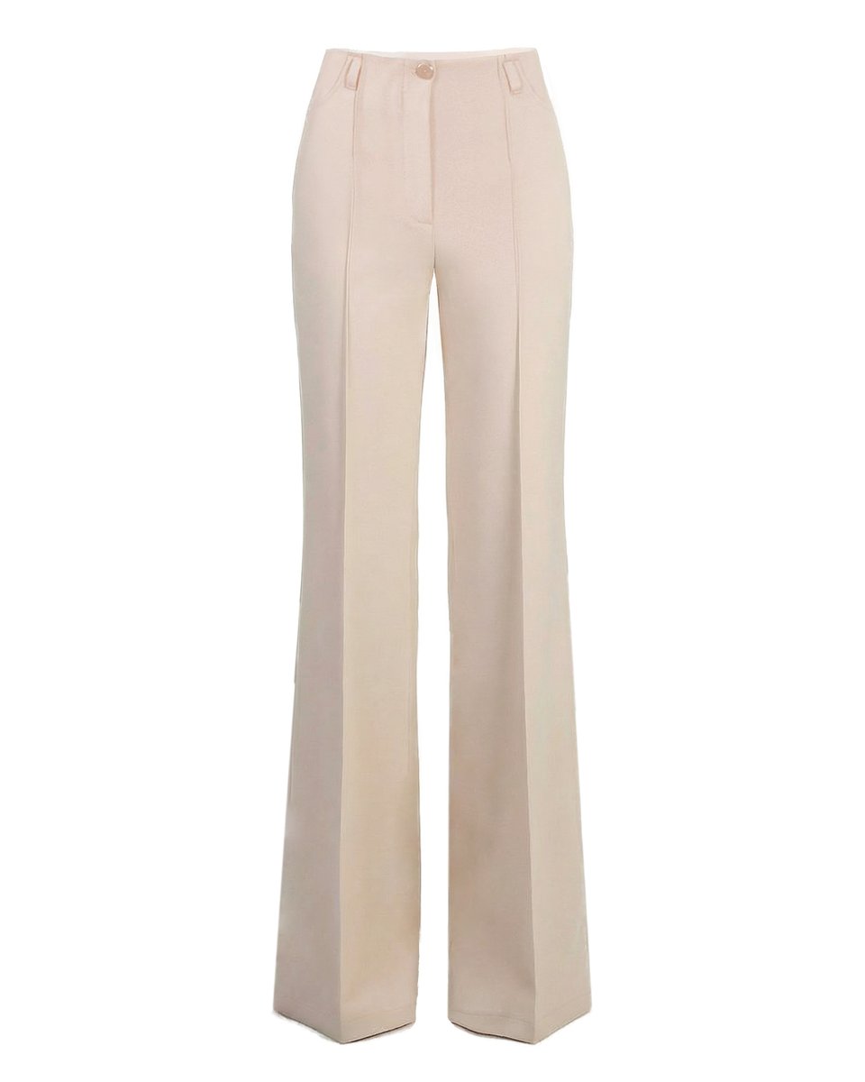 Брюки-клеш от бедра с простроченной стрелкой спереди в нарядном сливочном оттенке. Модель из плотной джерси обеспечивает деликатное облегание на бедрах и комфорт в движении. Этот крой уверенно вошел в модные базовые силуэты. Линия клеш едва заметная и очень мягкая и, тем не менее, этого достаточно, чтобы выгодно подчеркнуть фигуру и визуально удлинить ноги.