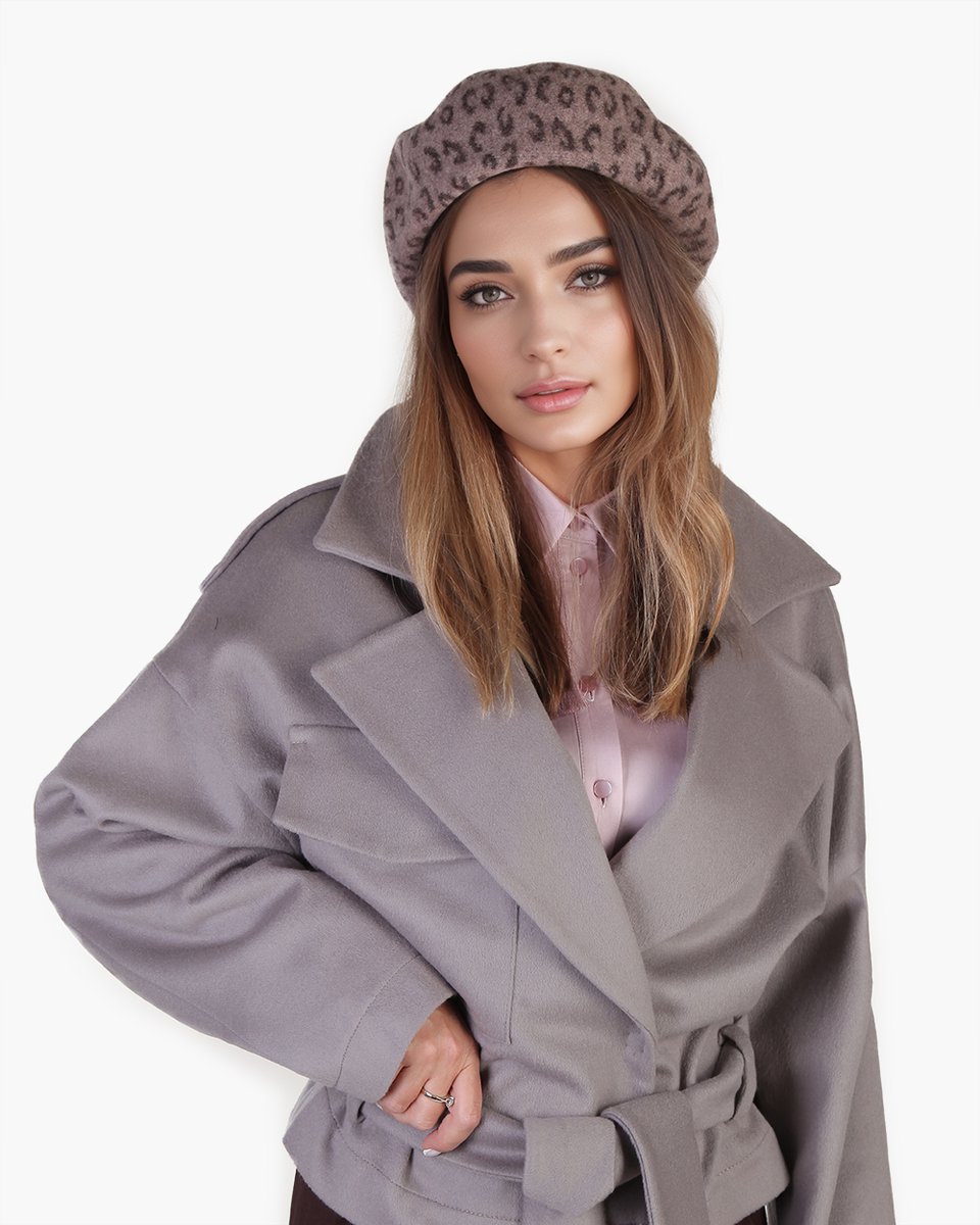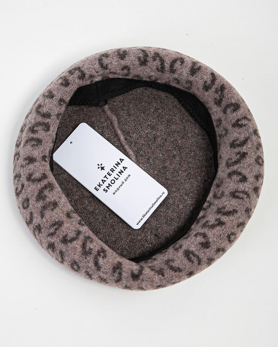 Шерстяной берет в бежевом цвете с леопардовым принтом. Головной убор нейтральной базовой гамме с деликатным анималистичным рисунком - это не броский, но заметный акцент вашего базового образа или дополнение к яркой куртке или пальто.