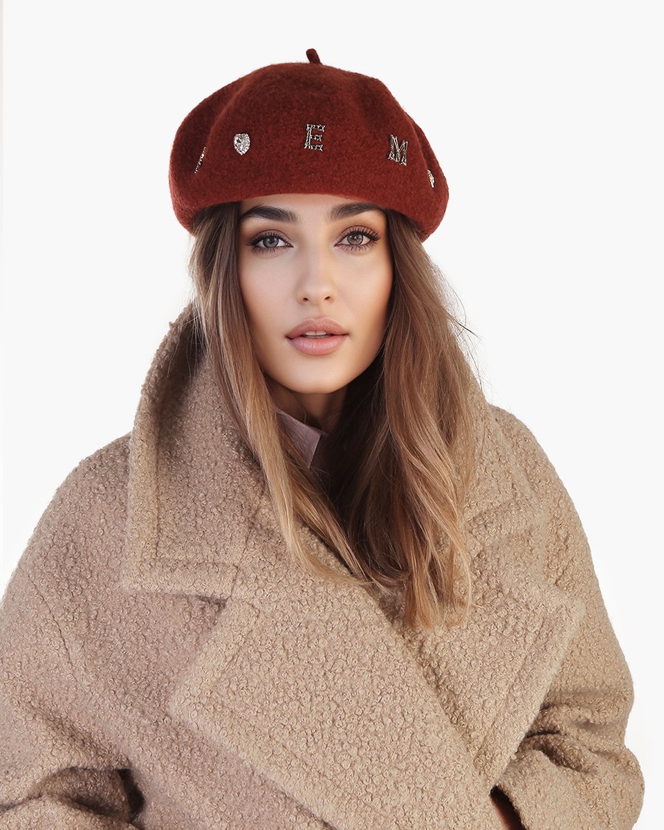 Берет из уютной смесовой шерсти, декорированный изящными буквами «ROEM», украшенными мерцающими кристаллами. Надпись добавляет аксессуару тонкую символичность и интеллектуальный шик. Классический силуэт берета сочетает в себе универсальность и характер: он дополнит элегантное пальто, придав образу завершённость, или станет ярким акцентом в образе с кожаной курткой и объёмным свитером. Идеальный выбор для тех, кто видит в деталях гардероба не просто украшение, а намёк, символ и игру смыслов.