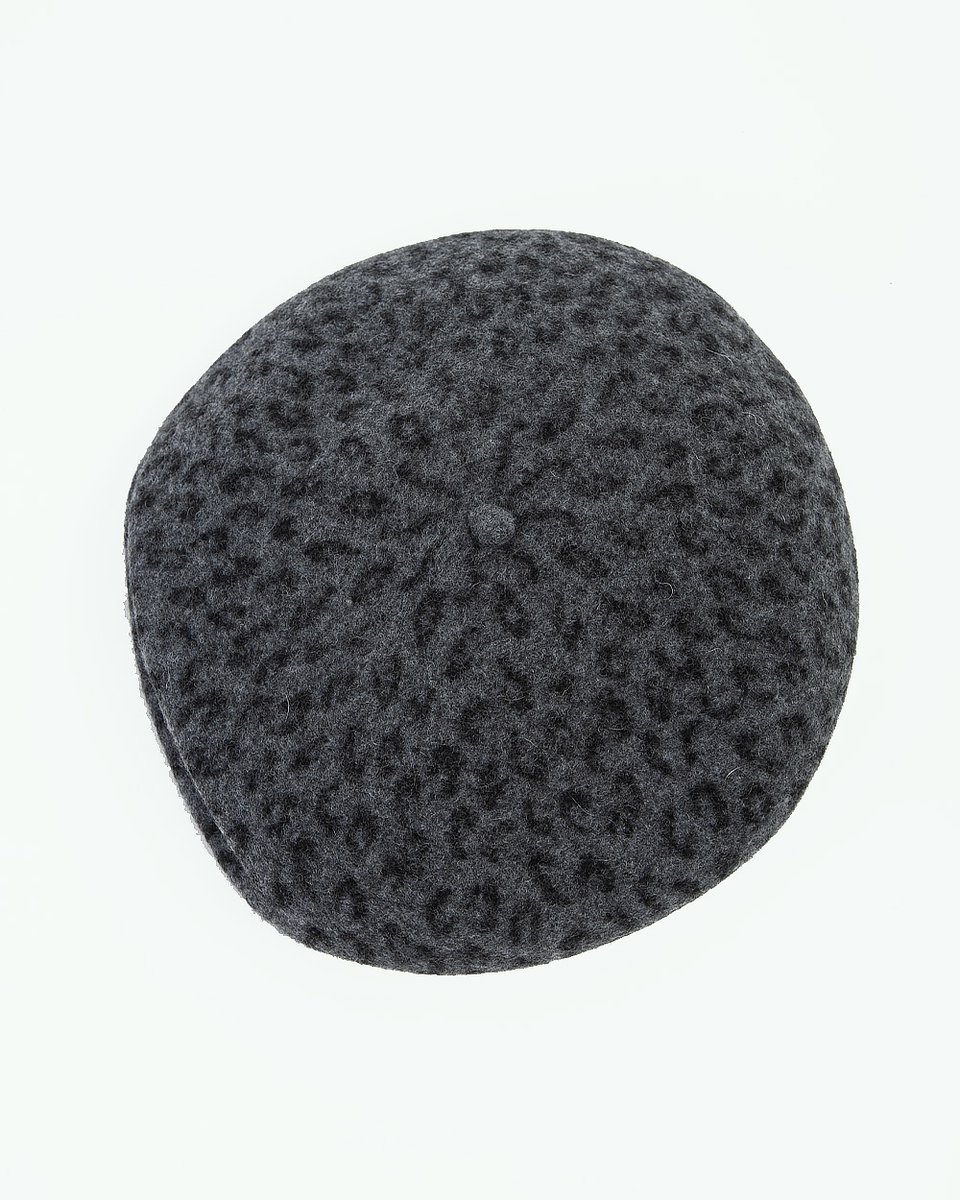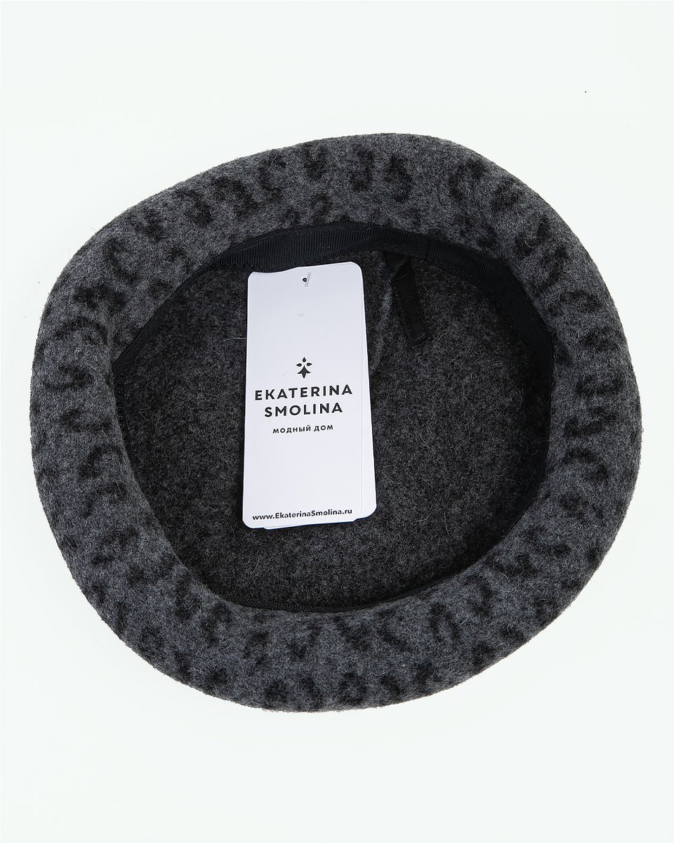 Шерстяной берет в свете темной дымки в леопардовый принт. Головной убор нейтрального цвета с деликатным анималистичным рисунком, это не броский, но заметный акцент вашего базового образа или дополнение к яркой куртке или пальто.