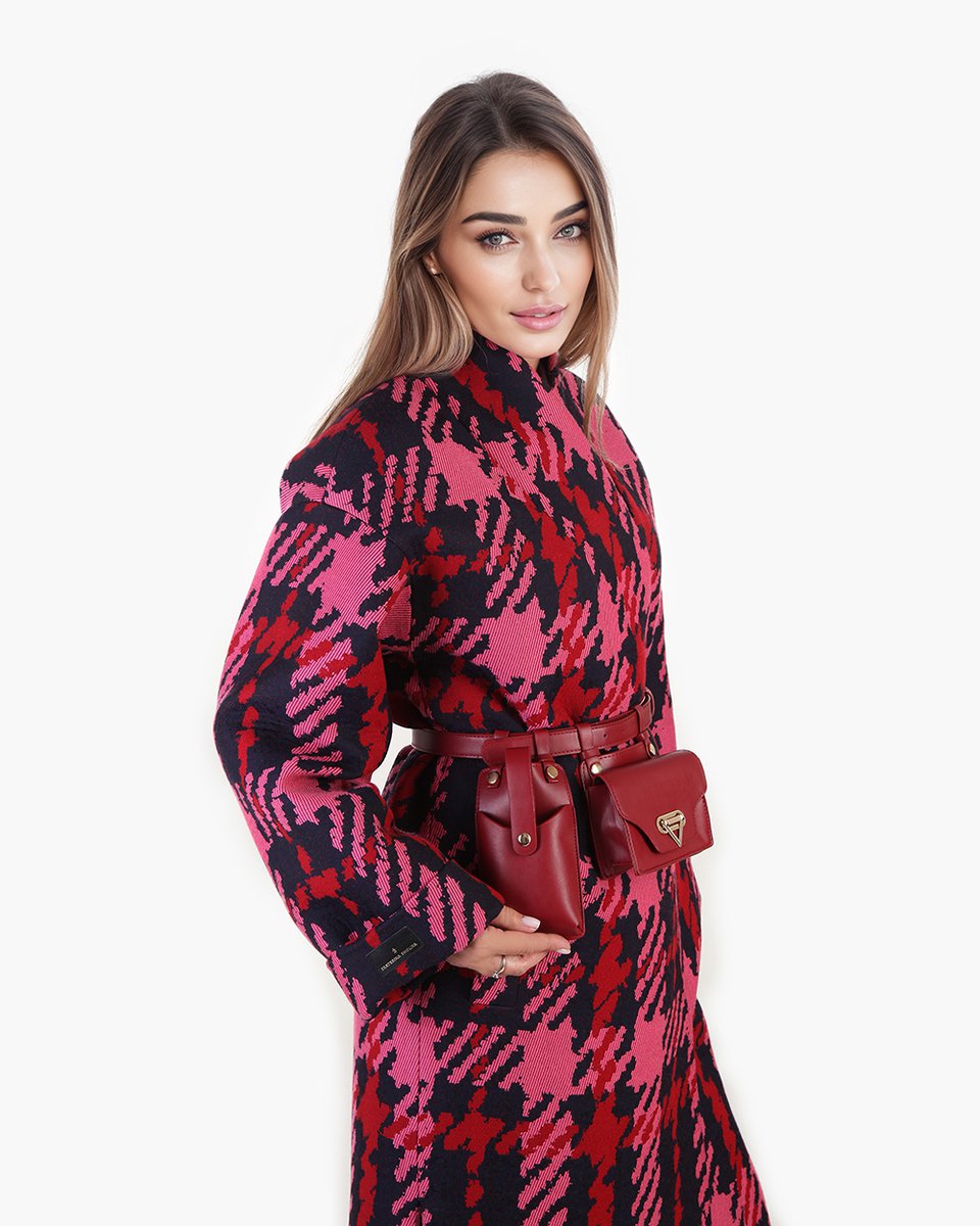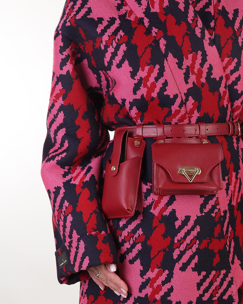 Ремень из гладкой эко-кожи со съемными карманами. Аксессуар выполнен из гладкой эко-кожи цвета бургунди с золотой фурнитурой. В комплекте два маленьких объемных кармана, которые вместят полезные мелочи, например ключи, помаду, банковские карточки. Ремень можно носить без карманов в базовом варианте, а также с одним или сразу двумя карманами. Это интересное дополнение к любому базовому образу, костюмному жакету, трикотажу или платью-рубашке.