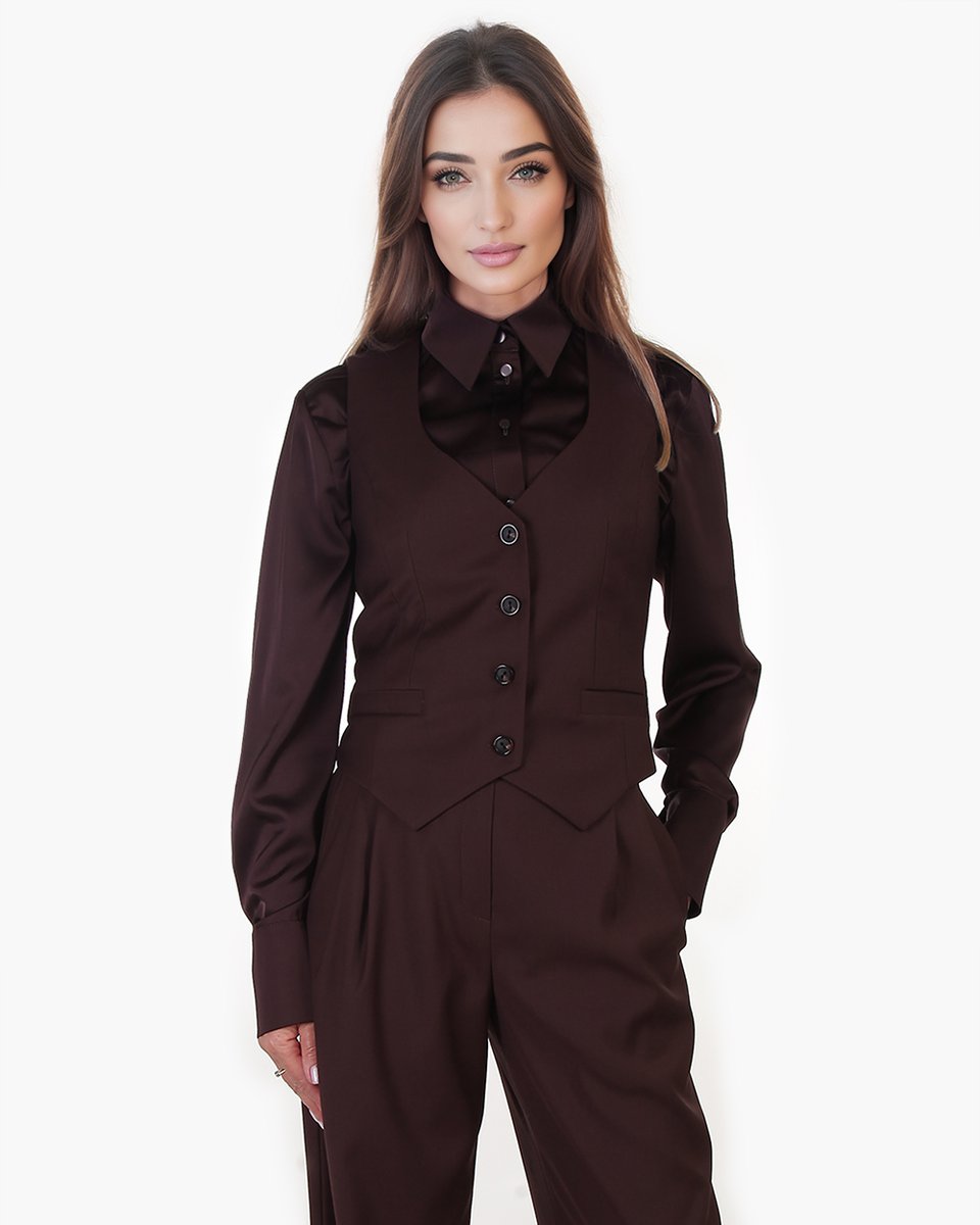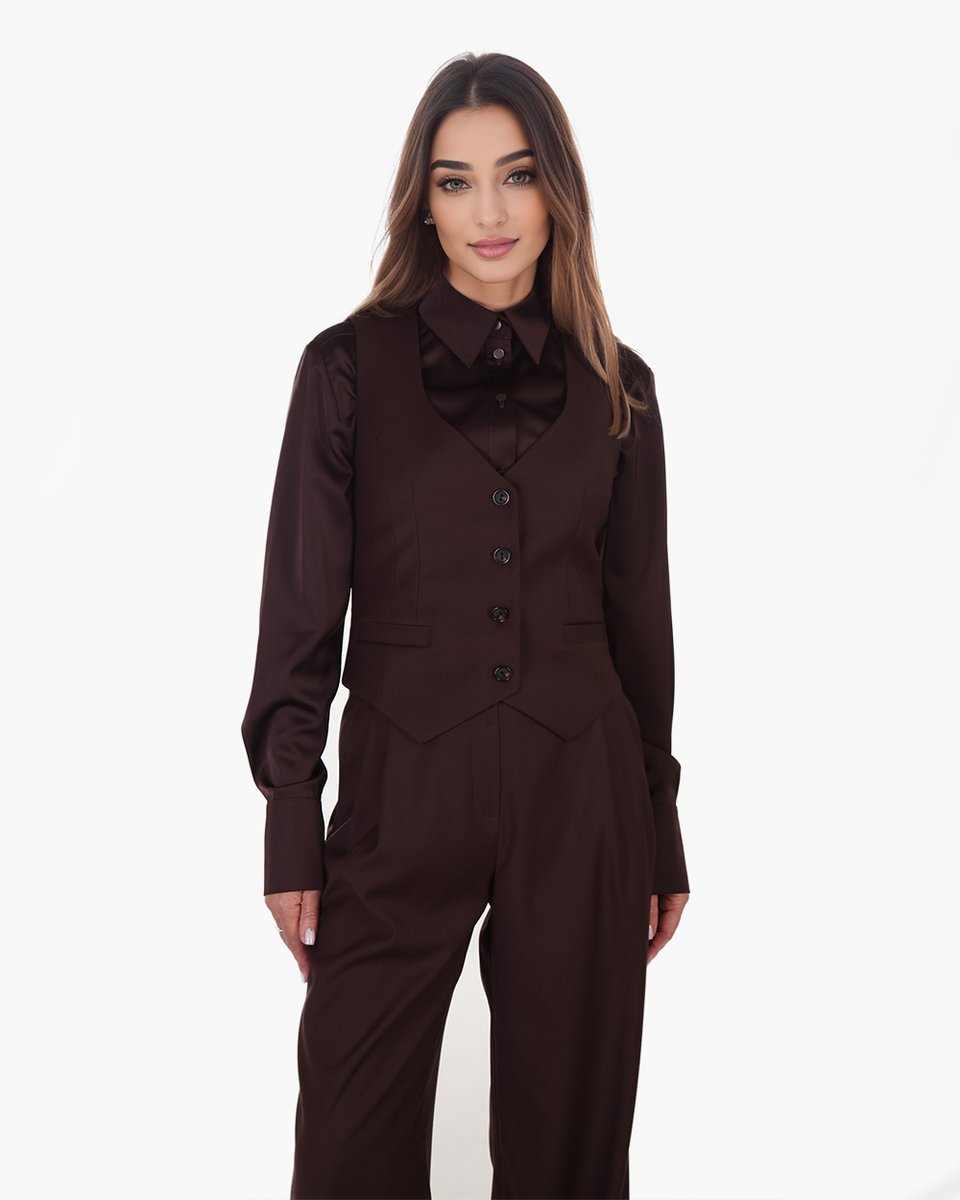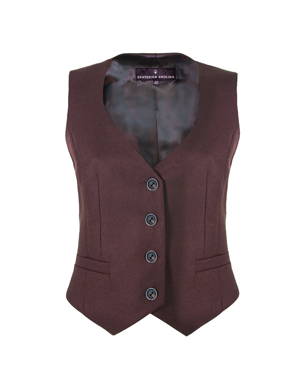Жилетка классического кроя трендового цвета горького шоколада. Жилетка из костюмной шерсти дополнит костюмные группы делового гардероба и повседневные образы с тонким трикотажем, денимом или платьями. В коллекции представлена в костюмной капсуле с юбкой, брюками и блузов в тон.