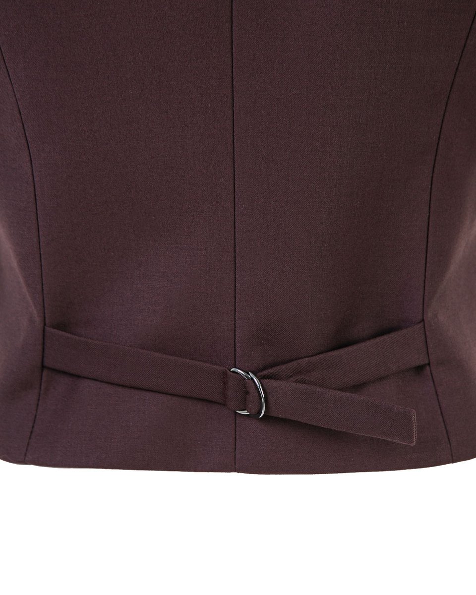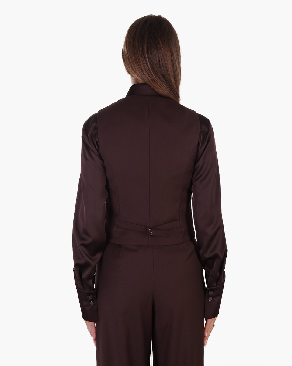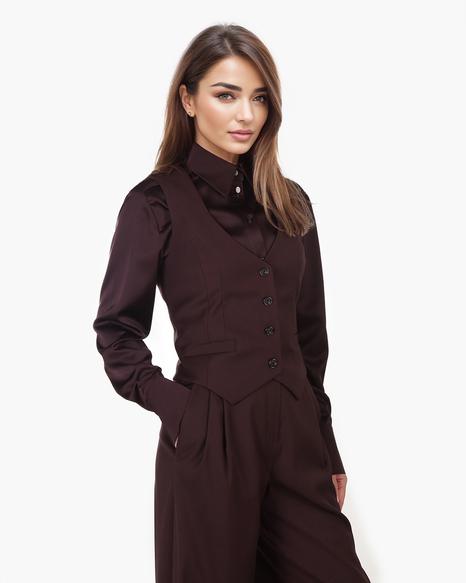 Жилетка классического кроя трендового цвета горького шоколада. Жилетка из костюмной шерсти дополнит костюмные группы делового гардероба и повседневные образы с тонким трикотажем, денимом или платьями. В коллекции представлена в костюмной капсуле с юбкой, брюками и блузов в тон.