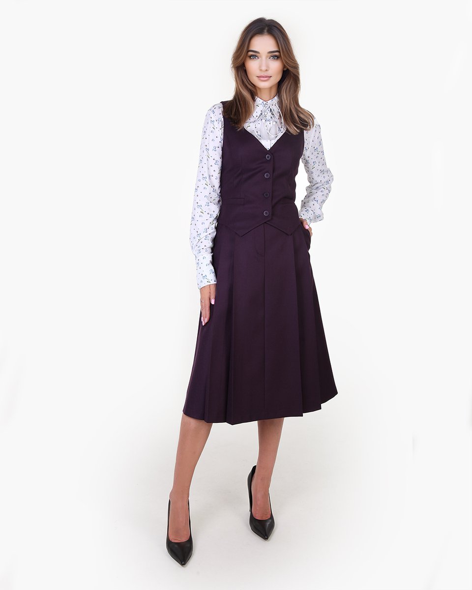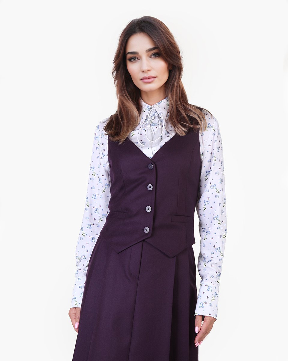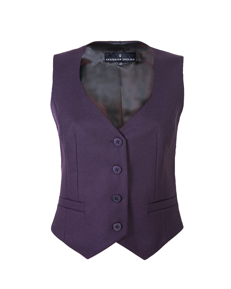 Костюмная жилетка классического кроя в богатом оттенке темный пурпур. В коллекции представлена с юбкой (арт. 3218-10) в тон. По желанию можно подобрать комфортный низ и составить костюм-двойку или -тройку. Классический жилет на голое тело добавит строгой пикантности образу с джинсами, а также составит деловой, но очень чувственный office-core look. Темный пурпур роскошно сочетается с золотом и серебром, украшениями с кристаллами, мягкими фактурами бархата и вельвета для вечерних образов. И с денимом или базовыми оттенками на каждый день.
